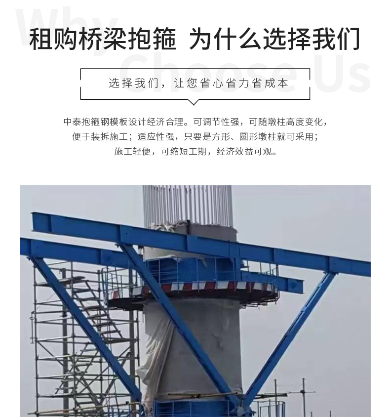 中泰抱箍钢模板设计经济合理。可调节性强,可随墩柱高度变化,便于装拆施工;适应性强,只要是方形、圆形墩柱就可采用;施工轻便,可缩短工期,经济效益可观。