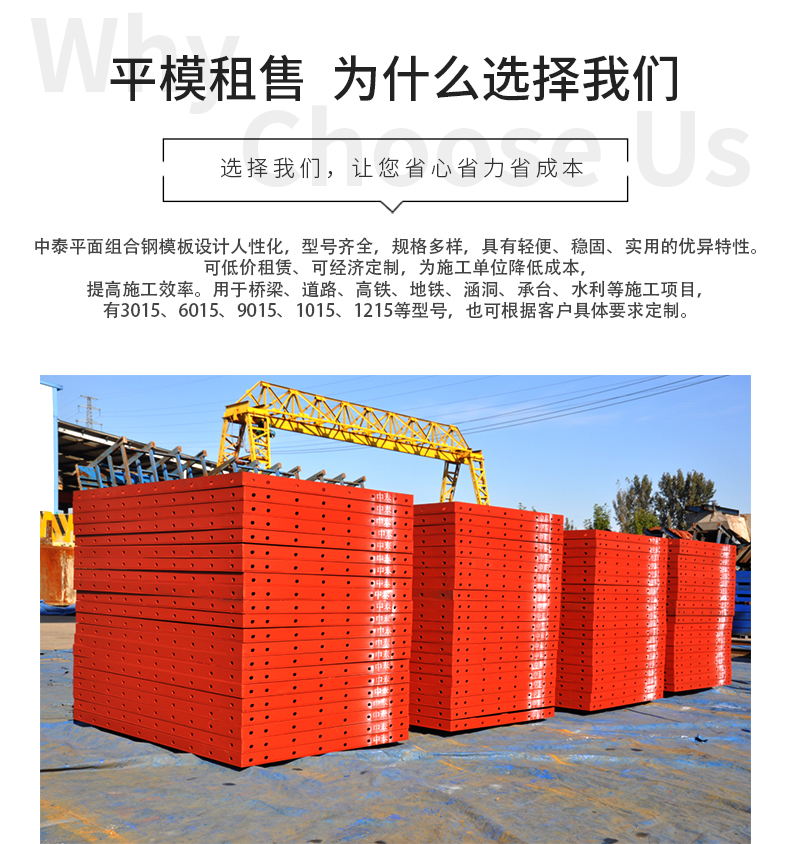 中泰平面组合钢模板设计人性化,型号齐全,规格多样,具有轻便、稳固、实用的优异特性。可低价租赁、可经济定制,为施工单位降低成本,提高施工效率。用于桥梁、道路、高铁、地铁、涵洞、承台、水利等施工项目,有3015、6015、9015、1015、1215等型号,也可根据客户具体要求定制。