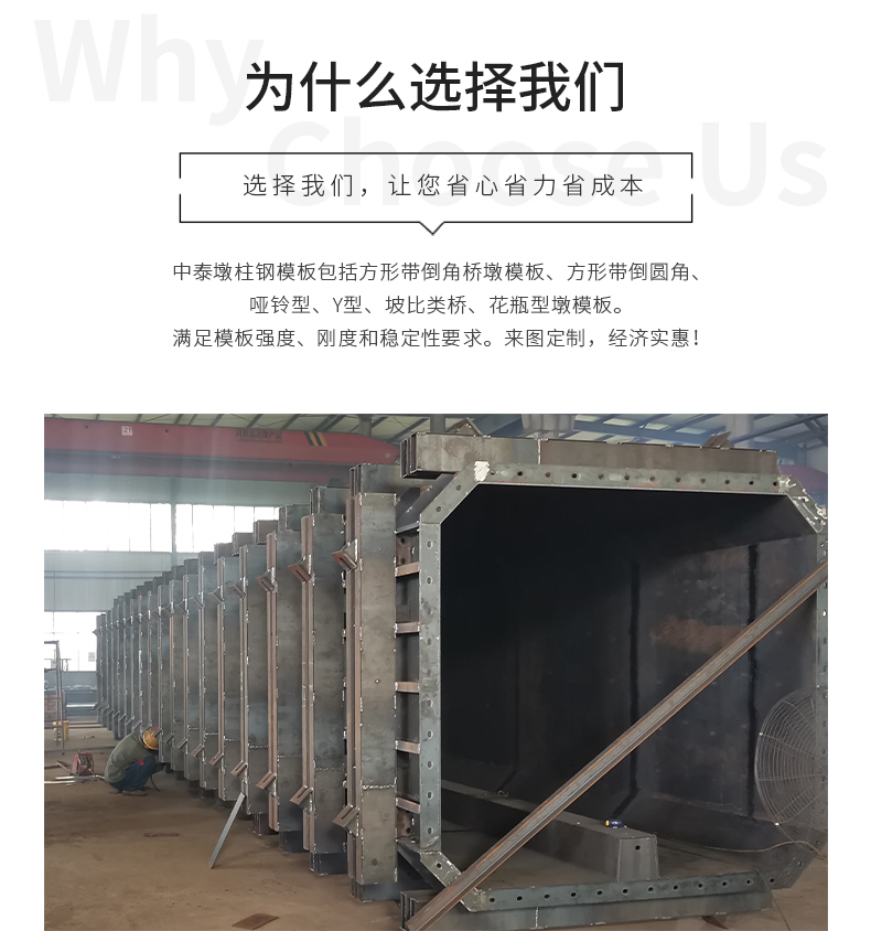 中泰墩柱钢模板包括方形带倒角桥墩模板、方形带倒圆角、哑铃型、Y型、坡比类桥、花瓶型墩模板。满足模板强度、刚度和稳定性要求。来图定制,经济实惠!