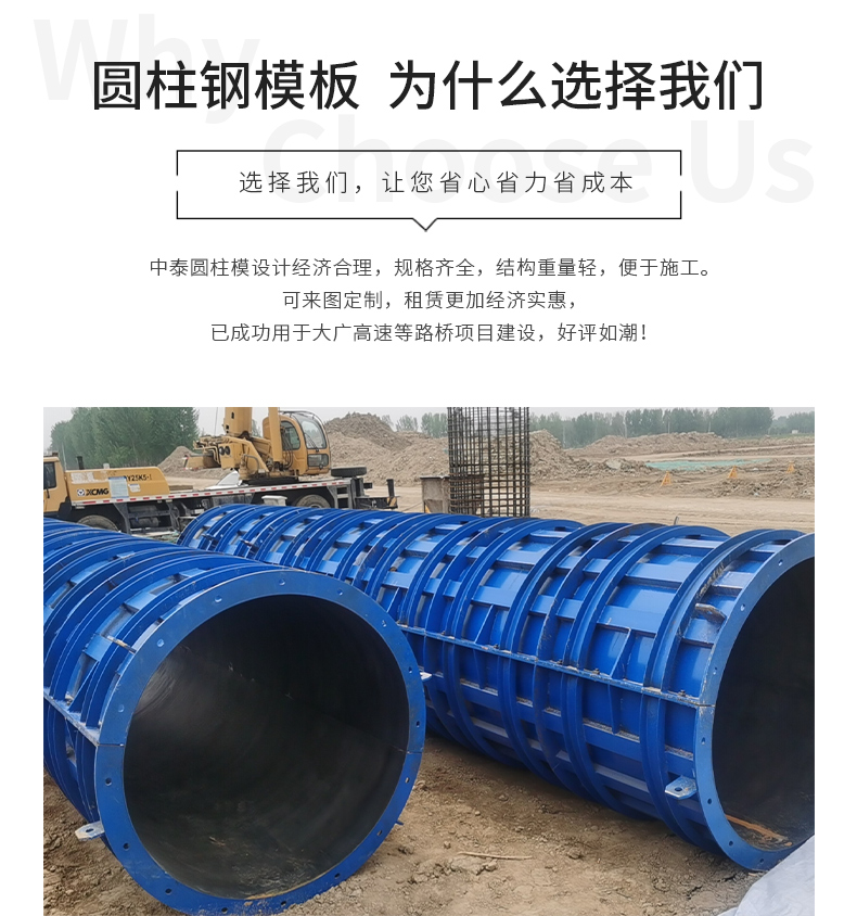 中泰圆柱模设计合理,规格齐全,结构重量轻,便于施工。可来图定制,租赁更加经济实惠,已成功用于大广高速、京台高速等路桥项目建设,好评如潮!
